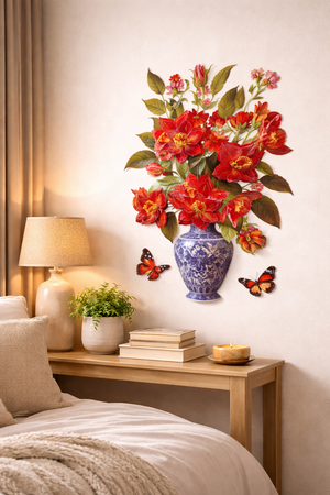 Enhance your home with this eye-catching 3D Red Floral Vase Wall Sticker. Featuring bold red blossoms arranged in an elegant blue ceramic vase, paired with delicate butterflies, this design brings warmth and charm to any wall.